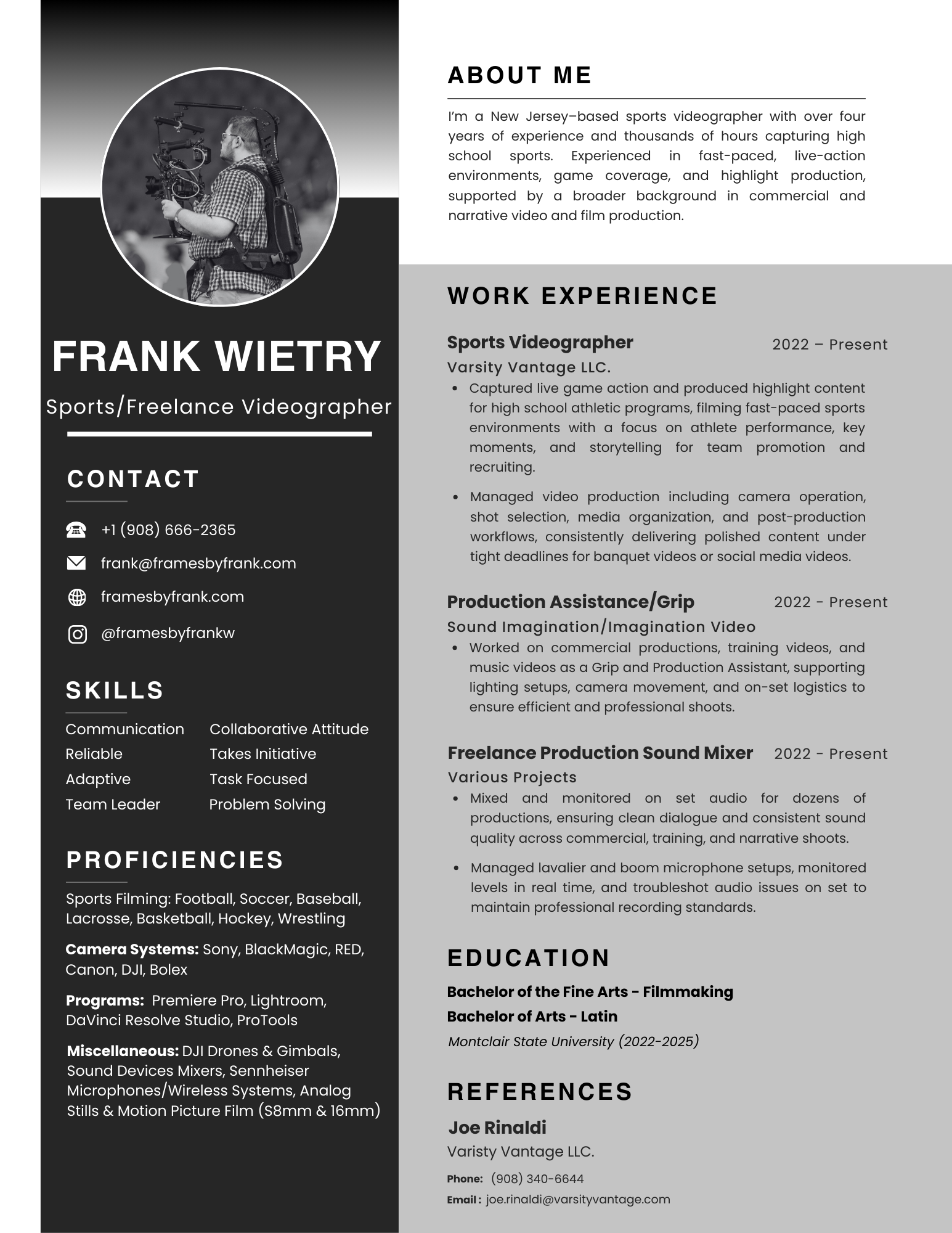 I’m a New Jersey–based sports videographer with over four years of experience capturing high school athletics, specializing in live game coverage, athlete highlights, and team storytelling. With thousands of hours spent filming fast-paced competition and additional experience on commercial, training, and music video sets, I bring a professional, detail-driven approach to every project